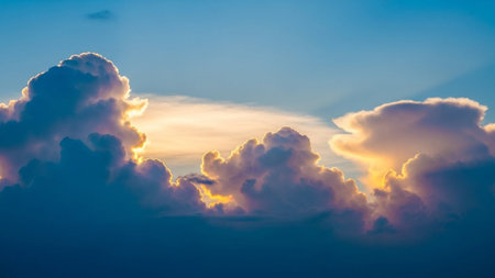 Experience the beauty of majestic clouds in a serene blue sky, presenting a captivating texture and soft light perfect for nature and travel themes.