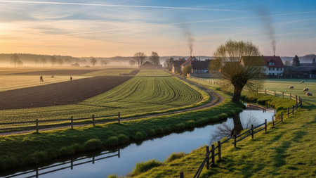 A scenic landscape showcases a calm river winding through green fields under a hazy sky. Smoke rises from unseen structures, the composition includes a path and fences. The image is bathed in soft sunlight, suggesting a morning setting. Suitable for various commercial and editorial applications.