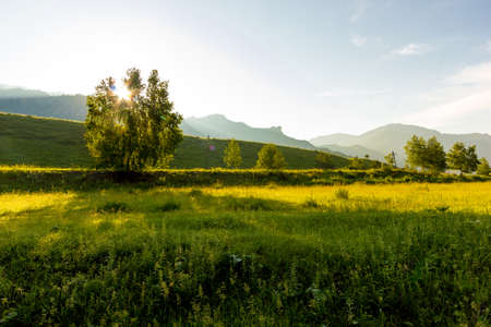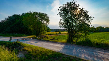 Beautiful summer landscape countryside at sunset. Path to the village. Great holiday home in the countryside. Evening