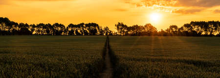 Panoramic sunset and clouds over a wheat field with a path to the horizon panorama web banner header