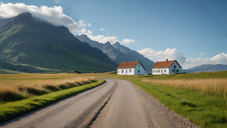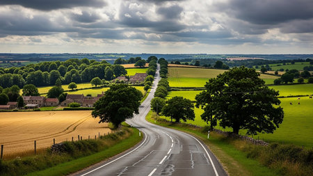 In the midst of a remote countryside the winding road stretches on passing by quaint villages and picturesque farms showcasing the . AI generation