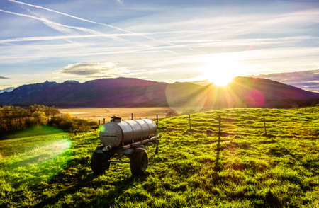 Small village in Alps at sunset. Swiss landscape with forests and meadows early in the morning. Agriculture in Switzerland, arable land and pastures.
