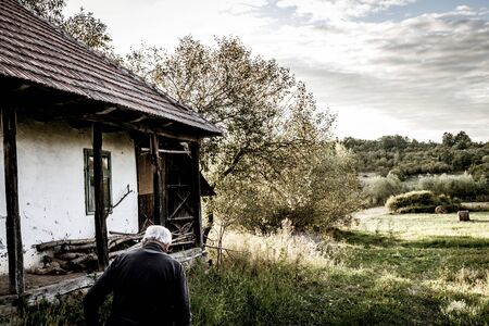 Vintage view of an old man walking near an old abandoned house with bales of hay in the grass field and forest covered hill in the background