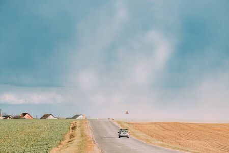 Belarus, Europe. Spring Dust Storm. A Dust Cloud From Agricultural Field Envelops Road Along Which Car Is Traveling