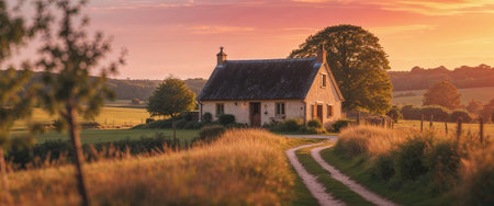 AI Generated. Cottage sunset valley landscape idyllic rural home