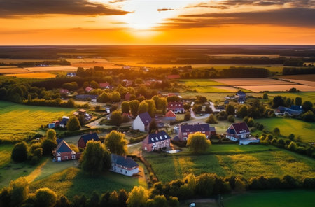 An aerial perspective showcases houses surrounded by greenery under an orange sunset. The composition includes roads, fences, and trees creating a picturesque environment. The lighting suggests an evening time, potentially suitable for travel or lifestyle content and various commercial applications.