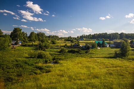 A rustic summer landscape in a temperate continental climate with houses, trees, green lawns and a pond. Banner. Horizontal orientation, selective focus.
