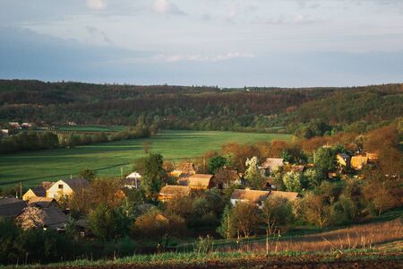 Panoramic view from the mountain to a small rural settlement among fields and forests at sunset in summer.