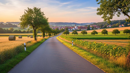 A paved country road winds through rolling green hills and golden fields towards a distant village under a warm sunset sky, with sunflowers blooming.