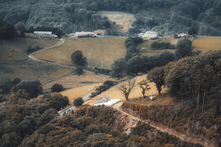 Picturesque rural valley landscape with winding dirt road, scattered farmhouses, fields, trees and hills, creating a peaceful countryside view in northern Spain mountains