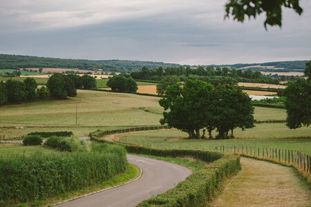 Landscape summer rural scene in France, region Burgundy. Road and nature in old europe. Countryside road in Burgundy.