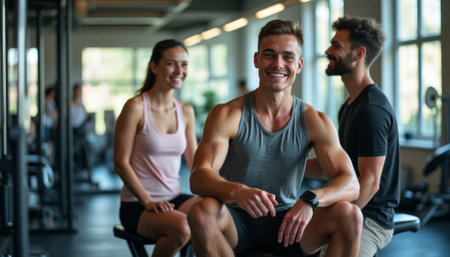 A group of three friends, two women and one man, share a joyful moment in a modern gym, radiating positivity and camaraderie. Their smiles and relaxed postures reflect the fun and motivation found in fitness, showcasing a vibrant atmosphere filled with energy and friendship.