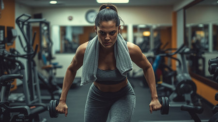 Young woman intensely working out at the gym, lifting dumbbells and sweating, focusing on her strength and fitness goals for a healthy and active lifestyle