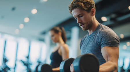 Focused athlete performs dumbbell exercises at the gym., generative AI