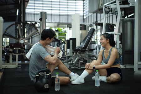 Two friends enjoying a break and laughing together during a workout session in a gym