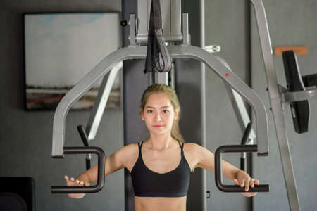 A beautiful Asian fitness woman is training with sport equipment in fitness gym. Fitness and health concept .