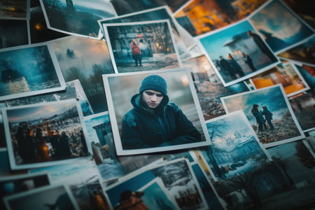 Hands grasp old photographs, revealing cherished memories in a cozy setting; a nostalgic atmosphere surrounds the warm hues of the images.