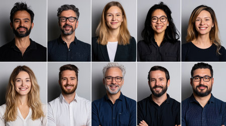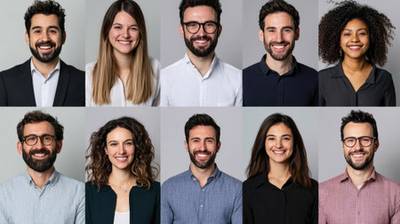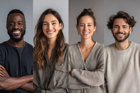 Portraits of smiling individuals showcasing diverse ethnic backgrounds against a neutral backdrop, conveying warmth and happiness in a friendly atmosphere