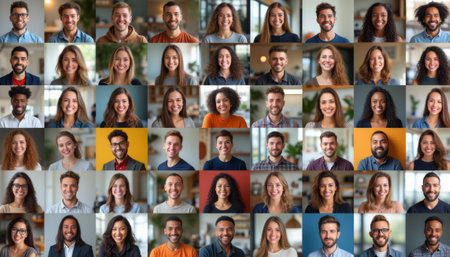 This captivating collage features a diverse array of smiling individuals, showcasing a rich tapestry of emotions and backgrounds. Each face radiates warmth and positivity, inviting viewers to connect with the joy and vibrancy of human experience.