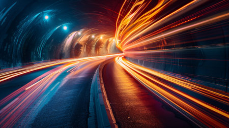 Colorful light streaks create a dynamic display as vehicles navigate a curved tunnel at night, showing the energy and movement in the urban landscape.