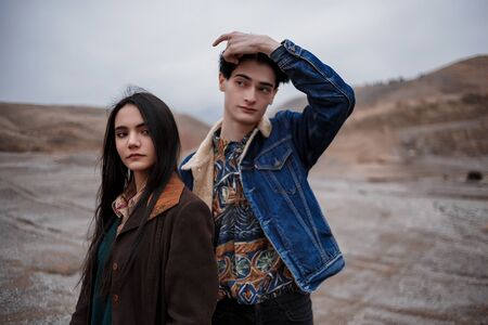 Dramatic portrait of a young brunette girl and a guy in cloudy weather. selective focus, small focus area.
