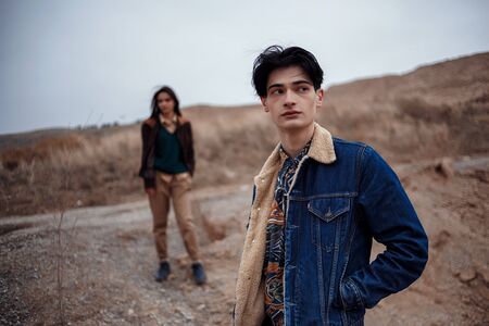 Dramatic portrait of a young brunette girl and a guy in cloudy weather. she's behind him. focus on the guy . selective focus, small focus area