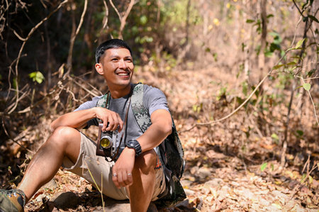 Happy and active Asian man with trekking gear and his retro camera sits on the rock, taking a rest after hiking the Rocky Mountain trail.