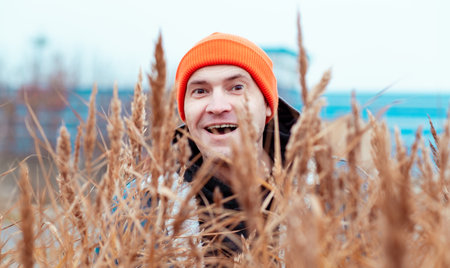 A man with an orange beanie smiles as he playfully peeks through tall dry grass in a natural landscape The overcast sky creates a serene atmosphere for outdoor enjoyment