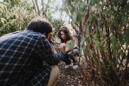Caucasian beautiful woman posing and laughing when cropped unrecognizable guy taking photo with camera. Two people traveling together in forest. Tourism, adventure and summer vacation concept