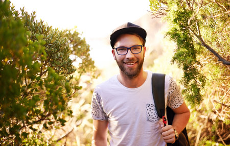Portrait, man and backpack on mountain outdoor of hiking adventure, travel journey and explore. Smile, male person and glasses with trekking getaway, sightseeing and vacation path of trip destination