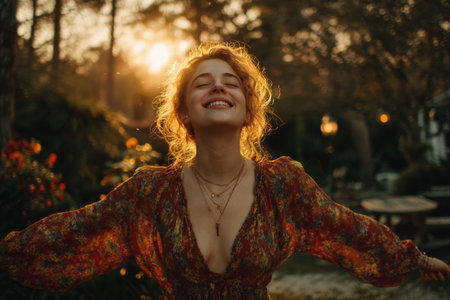 Joyful young woman with curly hair, wearing a floral dress, embraces nature in a sunlit garden, surrounded by colorful flowers and warm sunlight, expressing pure happiness