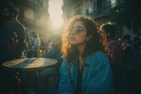 Modern Egyptian woman with curly hair in denim jacket and sunglasses, seated at cafe table, surrounded by lively atmosphere and warm sunset light