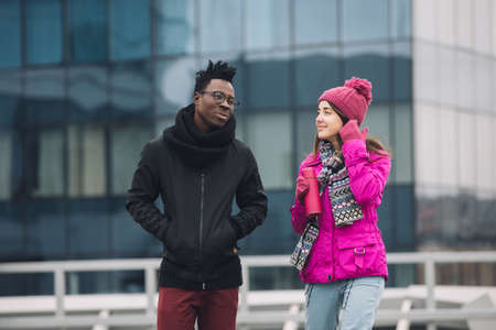 Trendy young couple enjoying sunny day downtown in stylish winter attire.