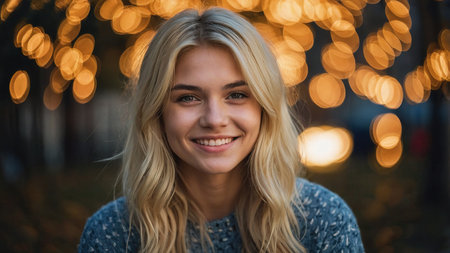 Smiling Young Woman Surrounded by Soft Glow of Fairy Lights in Evening Setting
