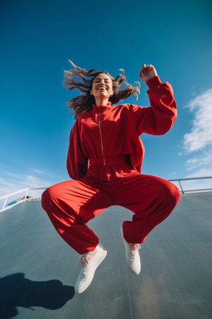 Energy inside her Full length of attractive young woman in casual wear keeping eyes closed and gesturing while jumping outdoors : Generative AI