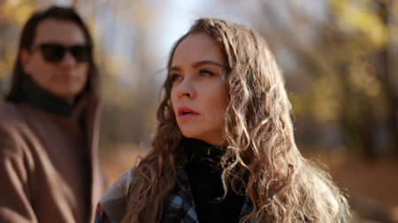 trouble in relationships of adult man and woman, portrait of lady in autumn park, walking away