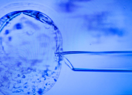 Micropipettes performing intracytoplasmic sperm injection into a human ovum under blue light, showing microinjection, genetic strands and assisted reproductive technology
