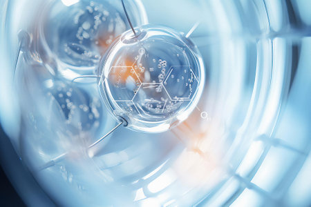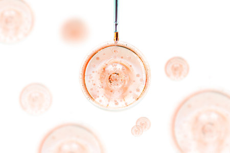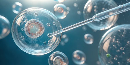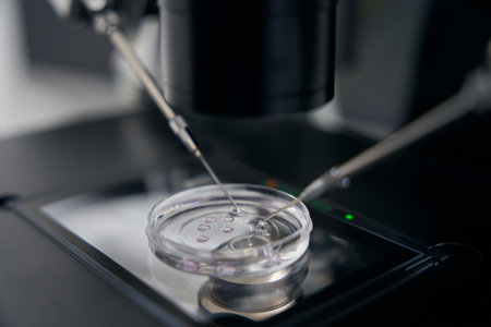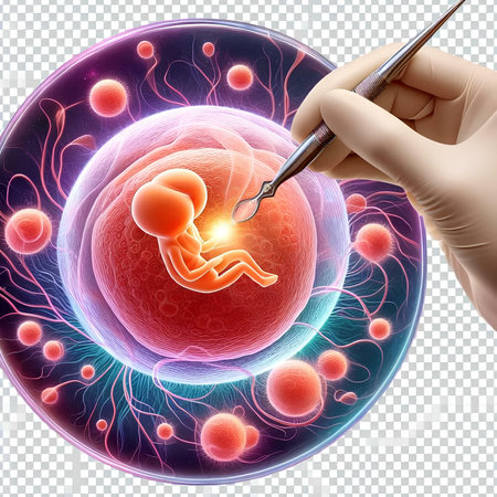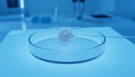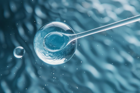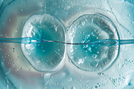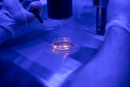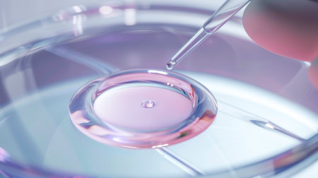 Embryo cells replicating inside a tiny droplet, being placed into a petri dish for in vitro fertilization, representing reproductive medicine and future possibilities
