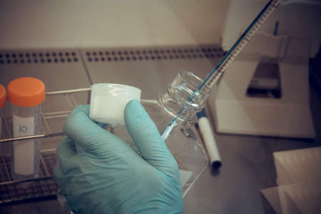 Hands of a scientist in the laboratory with a test tube and a microscope. The invention of the vaccine, a doctor in the clinic of artificial insemination IVF. Tests, fertilization of the egg