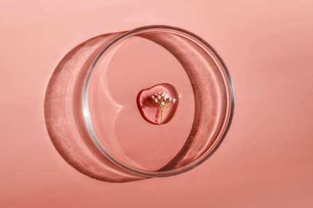 Laboratory glass petri dish with water, serum, oil, beauty product and flower. Natural medicine, cosmetic research, bio science. Concept of skincare and analysis. Dermatology. Flat lay, top view