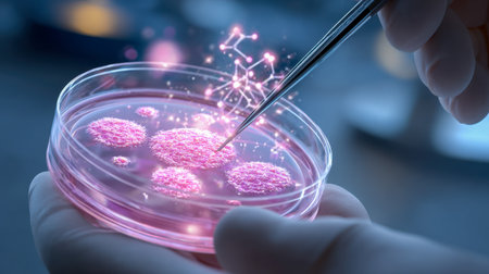Precision gloved hands carefully handle luminous pink cellular components with tweeters in a petri dish, illustrating cutting-edge molecular analysis and biological innovation.