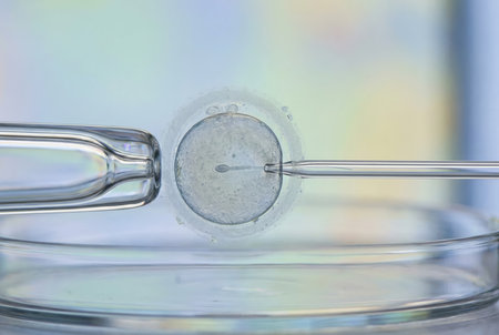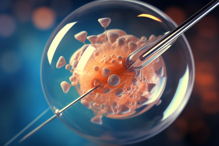 Egg cell receiving a sperm through a micro needle during intracytoplasmic sperm injection - icsi - procedure for in vitro fertilization, representing reproductive technology and fertility treatment