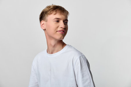 Young man wearing a white tshirt with a relaxed smile, looking to the side in a clean studio setting, casual mood, natural lighting, simple fashion shot without branding or accessories.