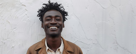 Joyful man with a spontaneous smile in casual fashion, standing against a minimalist textured white wall.