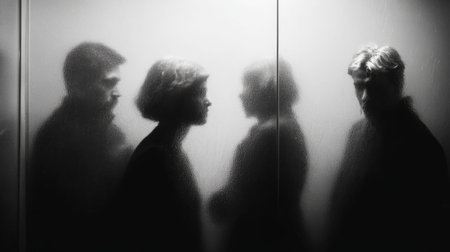 Figures stand behind frosted glass walls. The silhouettes show people in conversation, suggesting hidden political decisions. The scene lacks clarity and reveals obscured faces.