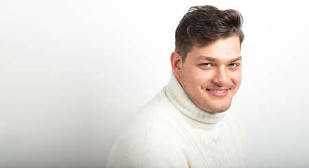 Handsome happy smiling caucasian male model posing for social advertisement, isolated on white background with copy space for your promotional information or content. Attractive man with healthy teeth