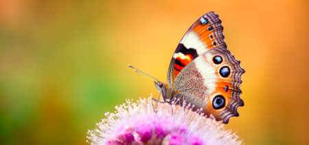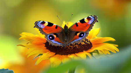 Colorful beautiful butterfly Peacock sits on a flower with spreading wings. Yellow-green summer sunny background with copy space