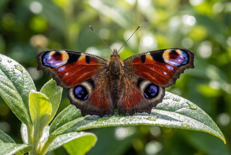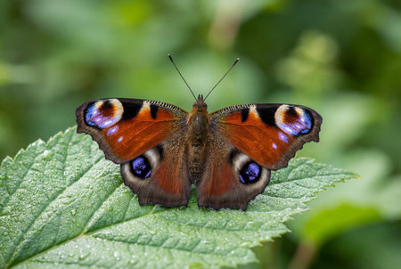 A beautiful european peacock butterfly or aglais io sits with spread wings displaying blue eyespots on a textured green leaf covered in fresh morning dew drops against a blurred natural background.