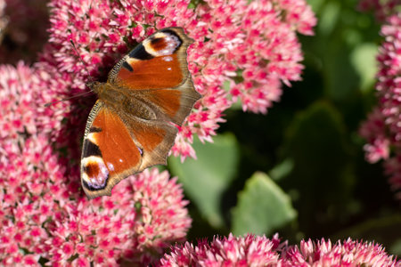 A peacock butterfly is eating on a pink Sedum flower - Hare cabbage. A flowerbed with flowers infested by insects. Butterflies fly. Nature sunny day. Insect. Butterfly wings.