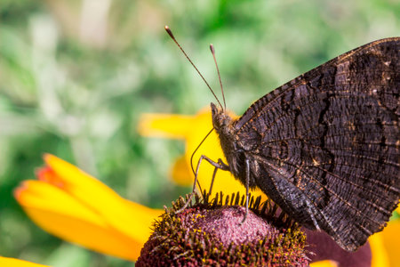 macro photo of a dark peacock butterfly, inachis io, drinking nectar from orange rudbeckia flower.